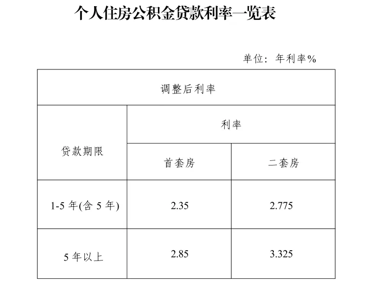首套個人住房公積金貸款5年以下(含5年)和5年以上利率分別調整為2.35%和2.85%。