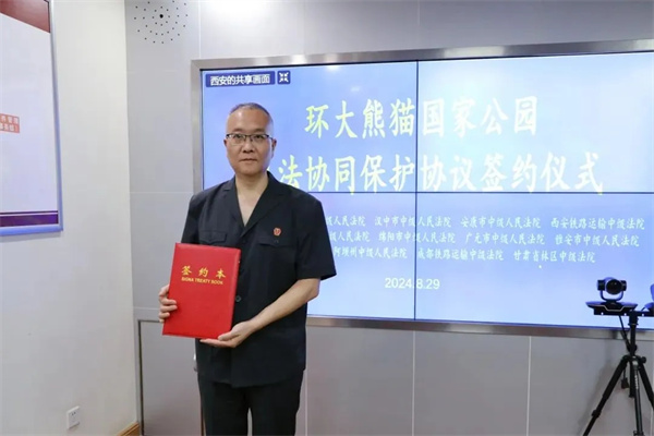 8月29日,陜西、四川、甘肅三地14家中院(即陜西省西安市、寶雞市、漢中市、安康市中級人民法院、西安鐵路運輸中級法院與四川省的成都市、德陽市、綿陽市、廣元市、雅安市、眉山市、阿壩州中級人民法院、成都鐵路運輸中級法院、甘肅省林區中級法院)共同簽署《環大熊貓國家公園司法協同保護協議》。簽約儀式采取視頻連線的形式召開,主會場設在西安市中級人民法院執行指揮中心,其他各中院設分會場,簽約儀式由西安市中級人民法院黨組成員、副院長李智平主持。安康中院黨組成員、副院長劉新建及行政庭全體干警參加儀式。