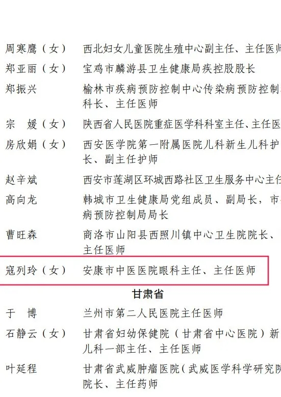 寇列玲,女,漢族,1975年10月生,陜西黃陵人,中共黨員,主任醫(yī)師,現(xiàn)任安康市中醫(yī)醫(yī)院眼科主任。該同志醫(yī)術(shù)精湛,服務(wù)患者耐心細致,心系社會,開展近視防控公益行進校園100余次,行程20萬公里,篩查學(xué)生10余萬人,受益學(xué)生50余萬人,解除安康山區(qū)數(shù)以萬計眼病患者痛苦,避免因盲致貧、因殘致貧。帶領(lǐng)眼科團隊銳意進取,眼科入選國家區(qū)域診療中心培育單位、國家中醫(yī)優(yōu)勢專科建設(shè)項目、陜西省區(qū)域診療中心。參與國家中醫(yī)藥管理局《前部缺血性視神經(jīng)病變》臨床指南制修訂,完成省中醫(yī)藥管理局十大病種《玻璃體積血》《消渴目病》創(chuàng)新項目,取得陜西省科技成果三等獎2項,被評為安康市第四屆十佳醫(yī)生稱號,榮獲安康市十佳科技青年獎,被評為安康市有突出貢獻專家,入選“西部之光”訪問學(xué)者。