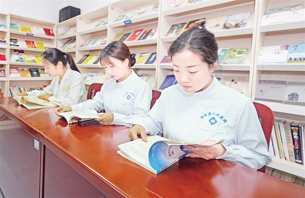 4月23日,白河縣人民醫院護士利用工作間隙在圖書角專注閱讀。(伍渭康 攝)