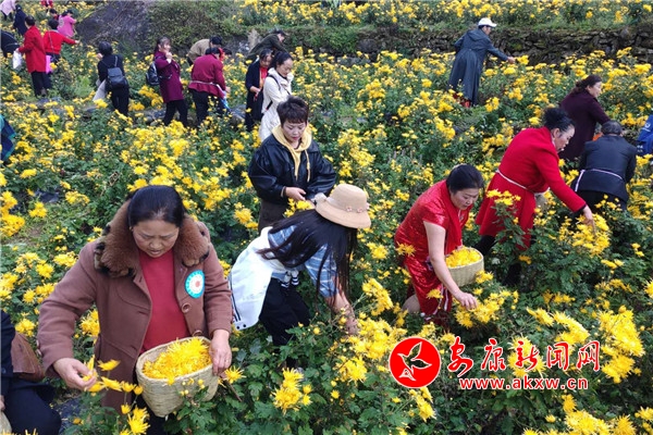 另一邊,百畝金絲黃菊爭相盛放,甚是好看。大家繞著山路健步而行。菊花種植基地里,游客們被花海吸引著,一邊賞花、采摘,一邊不由自主地踏入花海拍照。