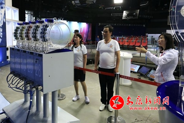 19時(shí),安康觀摩團(tuán)在工作人員的指導(dǎo)下,進(jìn)行了嚴(yán)格有序的安檢工作。每個(gè)人都需要將隨身所帶物品全部放入存儲(chǔ)柜。所有人員安檢結(jié)束后,通過專用通道,憑實(shí)名認(rèn)證的通行證進(jìn)入開獎(jiǎng)直播大廳。待大家整齊落座開獎(jiǎng)直播大廳后,工作人員再次講解注意事項(xiàng),并邀請(qǐng)觀摩團(tuán)收看了開獎(jiǎng)場(chǎng)地介紹、開獎(jiǎng)流程、數(shù)據(jù)封存及搖獎(jiǎng)設(shè)備四個(gè)短視頻。工作人員還將試機(jī)球發(fā)給觀摩團(tuán)成員,讓大家真實(shí)感受搖獎(jiǎng)球的質(zhì)地,四名幸運(yùn)站長被邀請(qǐng)到臺(tái)上零距離參觀搖獎(jiǎng)設(shè)備。
