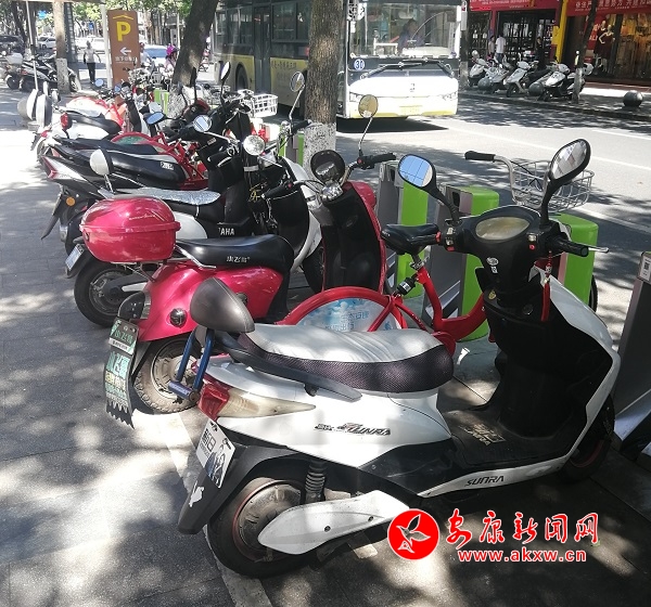 本網訊(記者 牟慶紅)7月31日,記者在興安中路一商城門前發現,大量摩托車、電動車扎堆停放在城市公共自行車樁旁,使得公共自行車無法停靠。