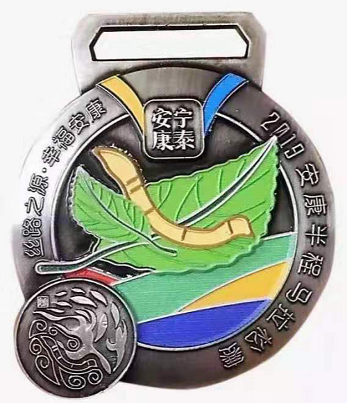 據(jù)獎(jiǎng)牌設(shè)計(jì)者金沙介紹,本次完賽獎(jiǎng)牌于十月初開始設(shè)計(jì),10月29日正式公布。獎(jiǎng)牌正面核心畫面選擇了出土于安康的一級(jí)文物—鎏金銅蠶,銅蠶附于桑葉之上,既突出了悠久的桑蠶文化,又是本次主題“絲路之源”的體現(xiàn)。
