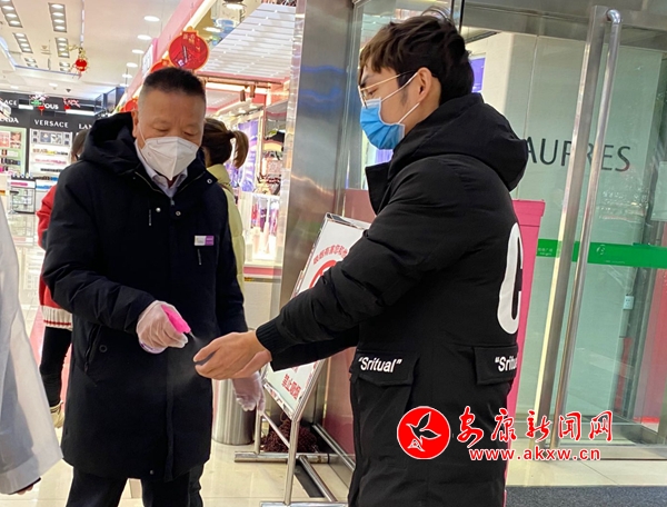 記者來到位于金州南路的時代購物廣場,觀察到店門口設有專門的測溫點,每個前來的顧客都需要先進行體溫測量,然后由工作人員對顧客的手部進行消毒,盡量保證顧客在選購貨品的時候不會產生交叉感染。同時,地上鋪有消毒地墊,每個顧客都需要踏上去對鞋底就行消毒。