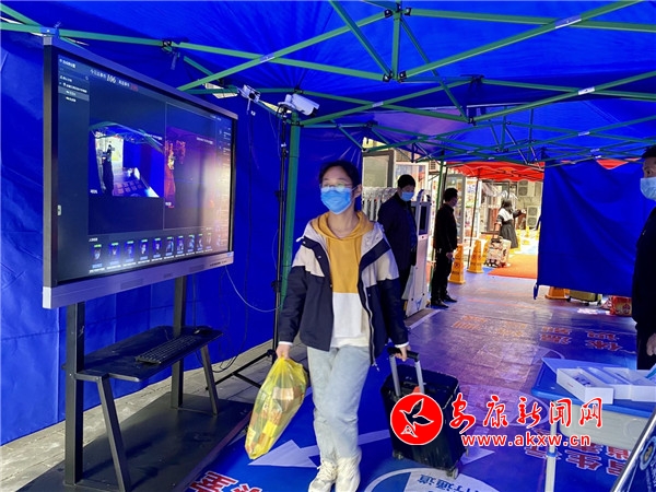 在漢濱初中高新校區(qū)校門口,記者看到學(xué)生們戴著口罩保持著安全距離在排隊(duì)進(jìn)入校內(nèi),旁邊還有很多幫孩子拿行李的家長(zhǎng)在向他們交代相關(guān)注意事項(xiàng)。排在前列的學(xué)生有序?qū)⒆约旱慕】敌畔⒈斫唤o負(fù)責(zé)檢查的工作人員核對(duì),通過之后會(huì)進(jìn)入一個(gè)設(shè)有熱成像紅外線人體測(cè)溫儀的檢測(cè)點(diǎn),每個(gè)從里面經(jīng)過的學(xué)生體溫都會(huì)出現(xiàn)在測(cè)溫儀的大顯示屏上,工作人員緊盯著屏幕排查異常人員。v9a安康新聞網(wǎng)