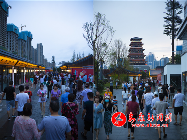 6月28日晚,夜色漸臨,漢江邊上,西城閣旁,古西城文化園(西城坊)游人如織。人們?nèi)宄扇海虺藳鲇瓮妫蚓鄄蜁痴劊慌煞比A熱鬧景象。(記者 張世虎 攝) Bw3安康新聞網(wǎng)
