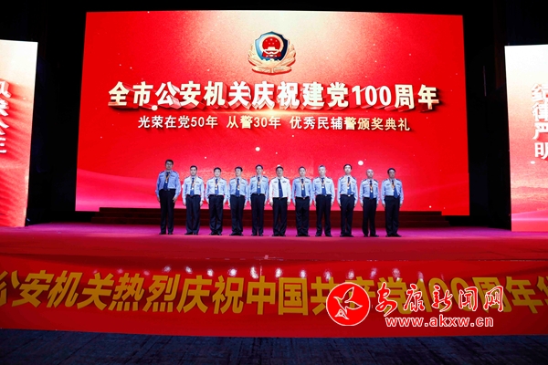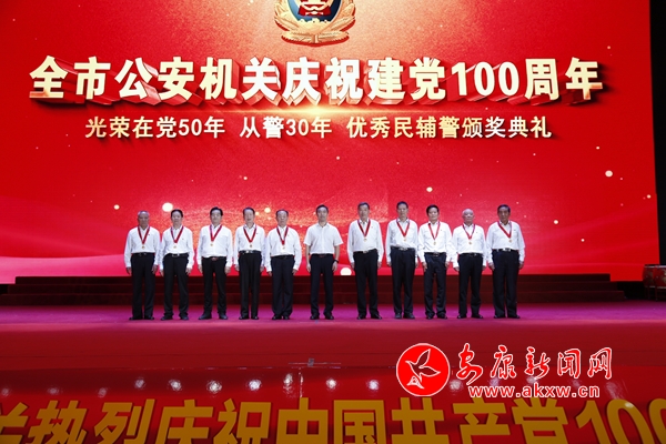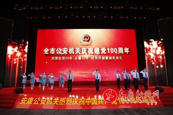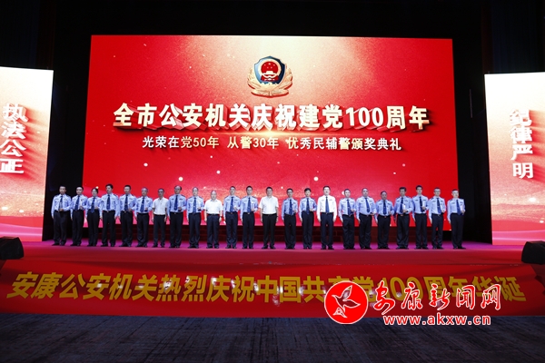 本次活動旨在全面展示全市公安隊伍教育整頓成果成效,大力弘揚公安英模精神,宣傳表彰隊伍中涌現(xiàn)出來的先進典型,凝聚警心、鼓舞士氣,激發(fā)廣大民警全力以赴做好保安全、護穩(wěn)定、抓改革、促發(fā)展各項工作熱情;顒臃譃榘矊幙堤⒗斡浭姑、不忘初心三個篇章,一曲曲高昂的贊歌,一幕幕鮮活的畫面,一個個感人的故事,生動再現(xiàn)了中國共產(chǎn)黨建黨100年來,矢志踐行初心使命,一路披荊斬棘、篳路藍縷,錨定奮斗目標,創(chuàng)造輝煌開辟未來的壯麗詩篇;形象展示了安康公安機關(guān)和廣大民輔警牢記初心使命,服務(wù)中心大局,扎實推進黨史學(xué)習(xí)教育和公安隊伍教育整頓,忠誠履職,砥礪奮進的良好形象;顒又,與會領(lǐng)導(dǎo)向優(yōu)秀民輔警頒發(fā)了獎杯,向“光榮在黨50年”代表頒發(fā)了勛章,向“從警30年”代表頒發(fā)了紀念章。