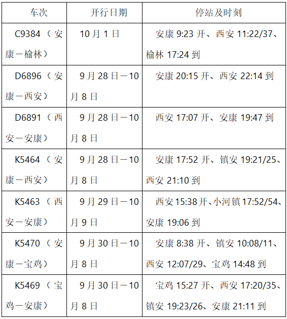 國慶加開列車車次、日期、停站及時刻信息如下:KwZ安康新聞網
