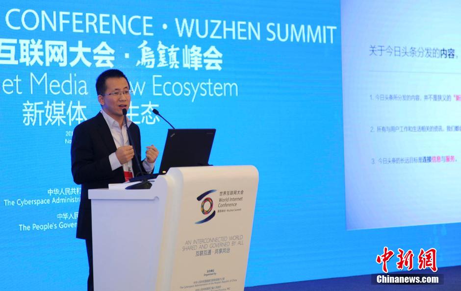 11月19日,今日頭條CEO張一鳴在浙江烏鎮舉行的首屆世界互聯網大會新媒體分論壇上發言。當天,世界互聯網大會在浙江烏鎮拉開帷幕。 中新社發 李晨韻 攝