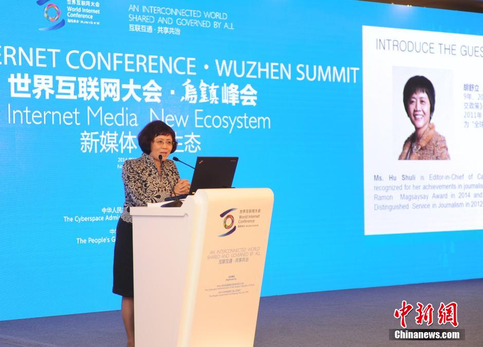 11月19日,財新傳媒總編輯胡舒立在烏鎮舉行的首屆世界互聯網大會新媒體分論壇上發言。當天,世界互聯網大會在浙江烏鎮拉開帷幕。 中新社發 李晨韻 攝