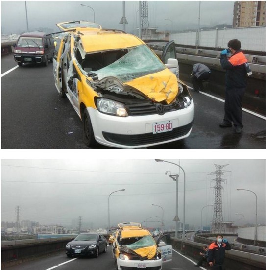 據臺灣聯合新聞網2月4日報道,臺北市4日上午傳出復興航空民航機墜落河面的意外,一輛行駛于環東快速道路上的出租車,意外受到機翼波及,車上包括一名女乘客被送往臺北忠孝醫院救治。圖為飛機墜落時砸到了停在橋上的的士汽車。ep2安康新聞網