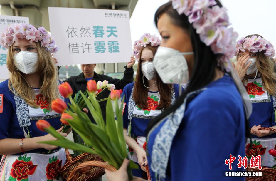 3月30日,六位靚麗“花仙子”統一著裝來到南京仙林地鐵二號線沿線新湖仙林翠谷,戴著過濾式口罩向過往的市民分發郁金香,以此提醒人們對空氣環境的關注、倡導綠色環保生活。中新社發 泱波 攝Am6安康新聞網