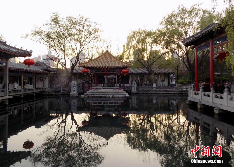 2016年3月27日,濟南著名的趵突泉和黑虎泉都已經十分虛弱,出水量大減。黑虎泉西側獸頭僅剩一點流水,停噴在即。 圖片來源:視覺中國