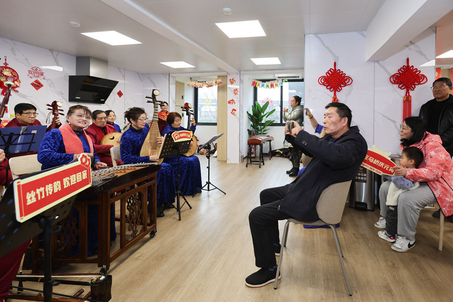 民樂隊在上海市閔行區新時代城市建設者管理者之家演奏(2024年2月23日攝)。新華社記者王翔 攝