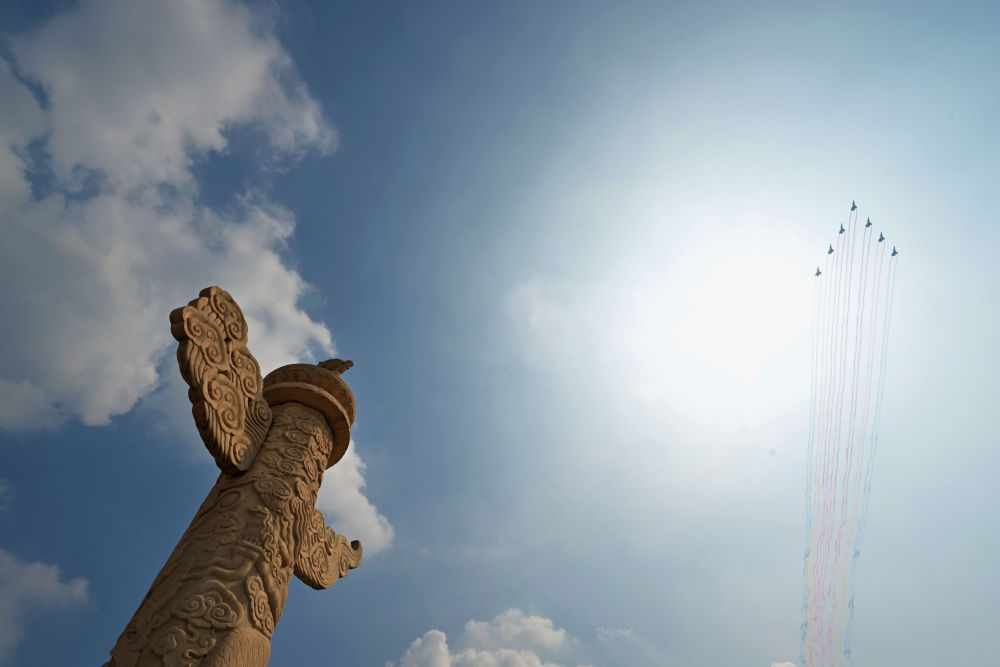 9月3日,紀念中國人民抗日戰爭暨世界反法西斯戰爭勝利80周年大會在北京隆重舉行。這是空中護旗梯隊接受檢閱。新華社記者王婧嬙攝
