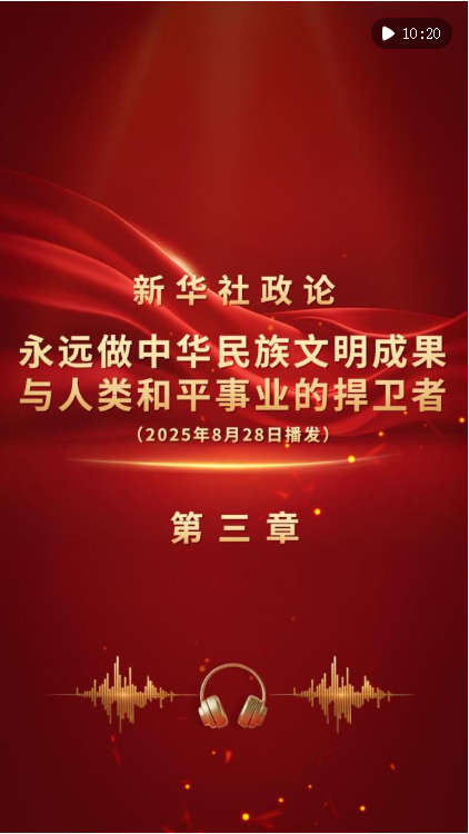 新華社8月28日播發《新華社政論|永遠做中華民族文明成果與人類和平事業的捍衛者——寫在中國人民抗日戰爭暨世界反法西斯戰爭勝利80周年之際》。我們邀請誦讀嘉賓吳樾演播“第三章”。bJH安康新聞網