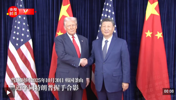 當地時間10月30日中午,中美元首會晤開始前,習近平同特朗普握手合影。
