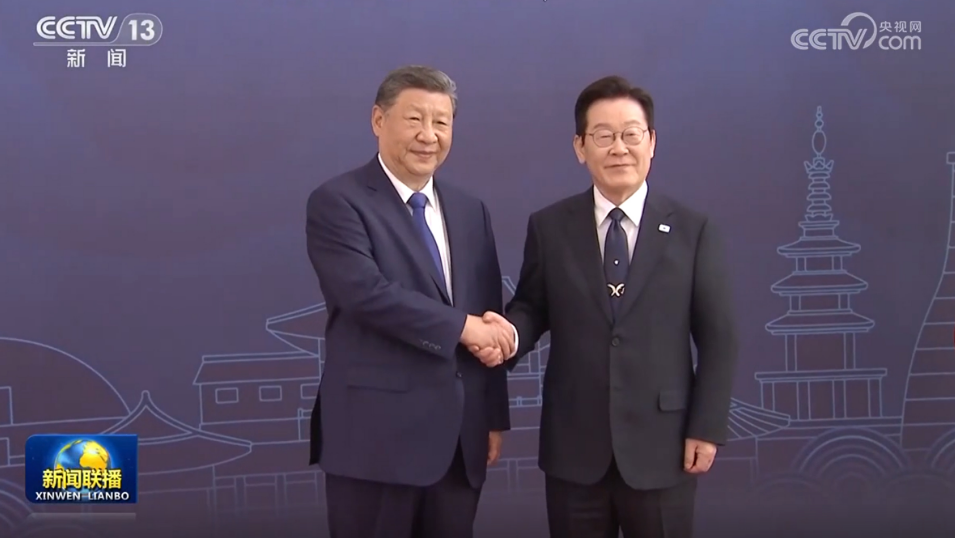 李在明熱情迎接習(xí)近平。兩國元首握手合影。