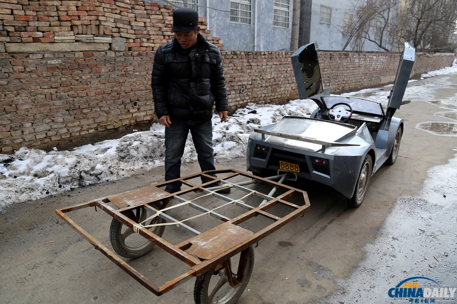 老郭平時做點小生意,為了拉東西,特意在車子后部設計了掛鉤,可與板車連接,跑車變成拖車。(侯建勛 攝)