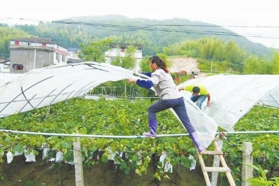 臺風“蘇迪羅”造成福安多個鄉(xiāng)鎮(zhèn)的葡萄園進水、大棚損壞。圖為連日來,松羅鄉(xiāng)尤沃村果農(nóng)加緊搶修葡萄園避雨大棚。何小麗 鄭祖輝 攝“蘇迪羅”卷走福……