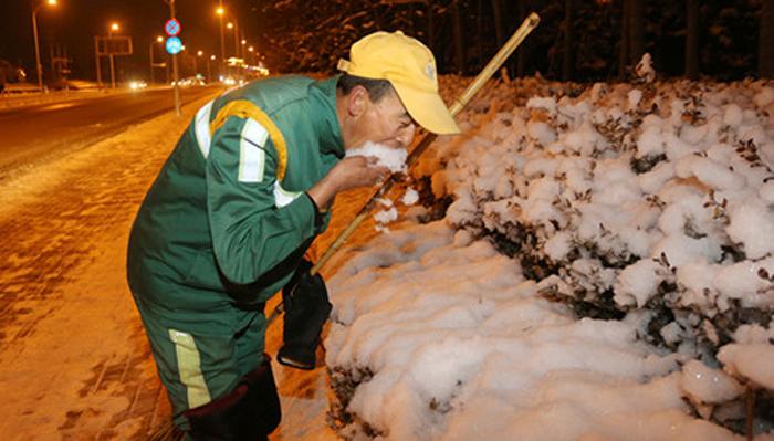 12月7日,遼寧大連,環衛工王喜義夫婦整整除雪17個小時。衣服被打濕,飯也來不及吃,只能抽空啃幾口饅頭;渴得實在受不了,他們會吃雪解渴。“我愛人拿掃帚掃道上……