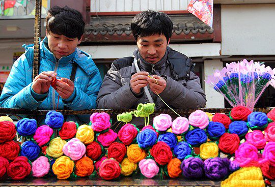2月10日,南京夫子廟老街上的兩位男青年用絨線和鉤針編織手工玫瑰花引來圍觀。中新社發 泱波 攝據了解,這兄弟倆來自河南商丘,哥哥叫張冰、弟弟叫張贊,他倆在……