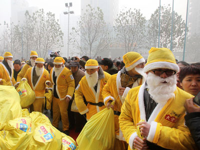 2013年12月24日,江蘇省南通市,游客們身穿圣誕老人的服裝用光電筆寫下2014。圖片作者:徐培欽/CFP2013年12月24日,鄭州市。圣誕老人們著黃裝開送禮動員大會。200……