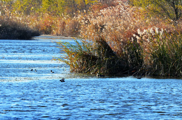 水鳥在濕地覓食、游弋(11月17日攝)。初冬時(shí)節(jié),山東省萊西市姜山濕地碧波蕩漾,成片蘆葦隨風(fēng)搖曳,數(shù)以千計(jì)的鳥兒在蘆葦叢中棲息、飛翔。該濕地總面積達(dá)2萬畝,……