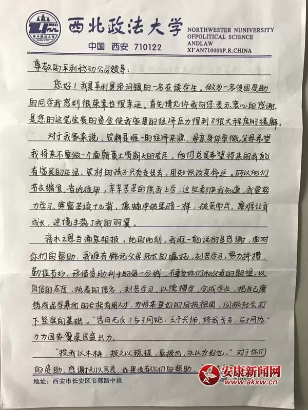 2016年11月24日一個(gè)平凡的日子里,一封從西北政法大學(xué)經(jīng)濟(jì)學(xué)院寄來的感謝信,“面對你們的幫助,我唯有銘記父母師長的囑托,刻苦學(xué)習(xí),努力拼搏,勤儉節(jié)約,珍惜資助到手的每一分錢,不辜負(fù)你們和父母的期望,以自信的態(tài)度,執(zhí)著的信念,刻苦學(xué)習(xí),以德博學(xué),完成學(xué)業(yè),把自己磨練成品學(xué)兼優(yōu)的合格有用人才,為將來更好的回報(bào)祖國,回報(bào)社會(huì)打下堅(jiān)實(shí)的基礎(chǔ)。”她叫王梅,出生于一個(gè)貧困家庭的大學(xué)生,家住陜西省平利縣洛河鎮(zhèn)線河村一組,父親身患?xì)埣玻赣H體弱多病,家庭生活僅靠父母務(wù)農(nóng)、打短工維系,家庭月收入不足千元,尚有患精神病的外婆需要贍養(yǎng)。
