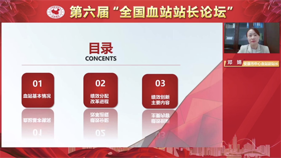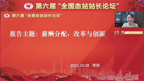 為加強全國血站的經驗交流與合作,2021年10月27日至28日,第六屆 “全國血站站長論壇”在深圳市舉辦。中國輸血協會理事長、世界衛生組織輸血合作中心主任朱永明,深圳市衛健委二級巡視員林漢城等相關領導出席并致辭。此次論壇的主題是“血站建設與發展、改革與創新”,來自全國各省、市血液中心(血站)的同仁通過線上方式參加會議。安康市中心血站副站長鄧娟作為全國血站六個優秀論文交流發言人之一,就安康血站績效分配、改革與創新工作在會上進行了經驗交流。