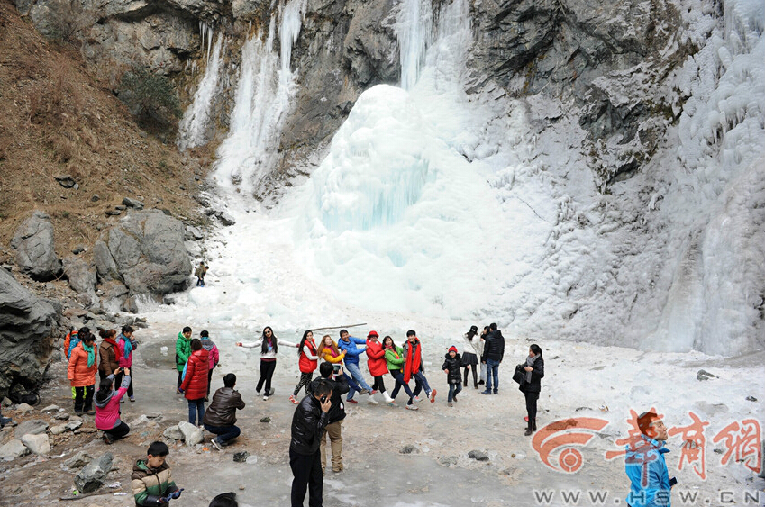 昨日下午2時(shí),游客在戶(hù)縣澇峪黑山瀑布前合影留念。不時(shí)有冰塊從瀑布上方掉落,著實(shí)讓人捏了一把汗 記者 趙彬 攝iks安康新聞網(wǎng)