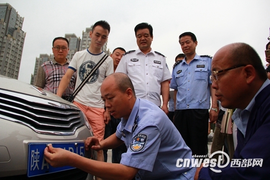 圖注:西安市車管所民警為第200萬輛機動車掛牌西部網訊(記者 孫鵬) 截止7月3日,西安市全市機動車保用量突破200萬輛大關。上午10時左右,交管部門在車管所舉行“第……
