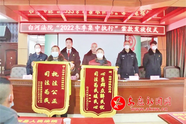 發(fā)放儀式上,通報(bào)了白河法院2022年冬季集中執(zhí)行行動(dòng)開展情況,對(duì)國(guó)家司法救助條件和程序進(jìn)行了詳細(xì)解讀, 32名申請(qǐng)執(zhí)行人領(lǐng)取了案款發(fā)款牌,發(fā)放儀式井然有序進(jìn)行。據(jù)悉,自2022年11月1日“冬季集中執(zhí)行行動(dòng)”開展以來,白河法院共執(zhí)結(jié)執(zhí)行案件474件,執(zhí)行到位金額9672.8萬(wàn)元,共宣布拘留12人,將69人納入失信被執(zhí)行人名單,向78人發(fā)出限制消費(fèi)令。該院集中執(zhí)結(jié)涉民生案件142件,執(zhí)行到位金額153.2萬(wàn)元,同時(shí)積極爭(zhēng)取資金,為困難申請(qǐng)人落實(shí)司法救助資金48.01萬(wàn)元。