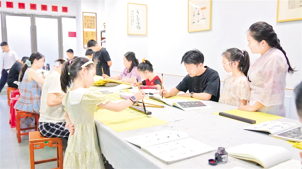 “我們來看下這‘海’字,是左右結(jié)構(gòu)的字,左邊的偏旁是一個三點水,三點水寫的時候要注意連貫性……”書法老師細(xì)致地拆解著漢字的書寫技巧,耐心指導(dǎo)著現(xiàn)場的每一位學(xué)員。