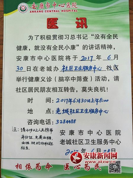 安康新聞網訊(通訊員 成英豪)為了積極貫徹習近平總書記“沒有全民健康,就沒有全民小康”的講話精神,安康市中心醫院將派出專家團隊于2017年6月30日在漢濱區老城……