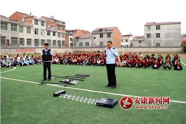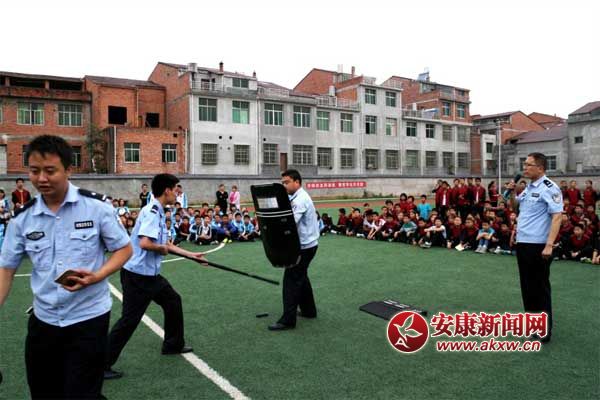 在活動過程中,該所副所長陳小兵先進行了法律知識講座。講座中,陳所長針對青少年犯罪的性質(zhì)、特點、根源,結合青少年的生理、心理特征,以生動的事例,詳實的資料,通俗的語言,解讀了一個個觸目驚心的青少年犯罪案例,給學生上了一堂生動的法制教育課。緊接著公安民警又向師生們展示了催淚噴射器、警棍、鋼叉、阻車器等警用裝備并模擬在遇到壞人時應如何正確使用這些警用裝備以便最迅速、有效地將壞人制服,師生們聽得聚精會神,博得了師生的陣陣掌聲。