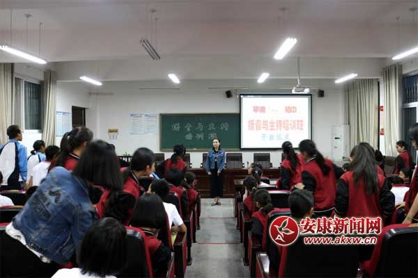 在舉行了簡短的開班儀式后,學(xué)校聘請(qǐng)的漢陰電視臺(tái)主播楊晶晶進(jìn)行了第一次培訓(xùn)。40多名播音主持愛好者參加了培訓(xùn)。培訓(xùn)中楊老師主要和同學(xué)們分享主持人臺(tái)風(fēng)和態(tài)勢(shì)語等方面的知識(shí)。楊老師惟妙惟肖地對(duì)主持人如何做到走姿站姿大方得體、微笑眼神交流傳神、肢體語言表情達(dá)意等向同學(xué)們進(jìn)行了細(xì)致講解。在理論講解的同時(shí),又與同學(xué)們進(jìn)行了現(xiàn)場互動(dòng)實(shí)踐練習(xí),同學(xué)們個(gè)個(gè)聚精會(huì)神,積極參與互動(dòng)。楊老師幽默風(fēng)趣的授課贏得了陣陣掌聲,同學(xué)們?cè)谳p松愉快的課堂上既學(xué)到了專業(yè)知識(shí),又在實(shí)踐中得到了專業(yè)技巧的點(diǎn)撥。
