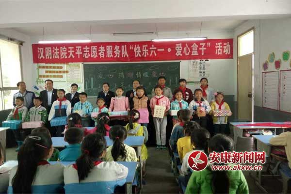 5月27日,漢陰縣人民法院天平志愿服務隊5余名志愿服務者冒雨從縣城驅車50余公里,走進漩渦鎮堰坪小學,將60余份裝有乒乓球拍、圖書、文具等學習用品的“愛心盒子”送到留守兒童手中,讓孩子們感受“六一”的快樂。