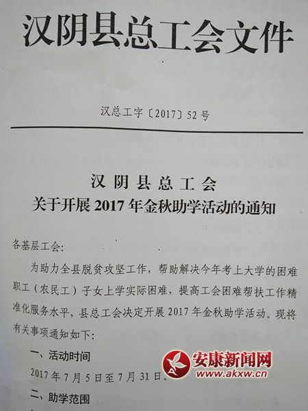 安康新聞網訊(通訊員 儲毅)為助力全縣脫貧攻堅工作,幫助解決今年考上大學的困難職工(農民工)子女上學實際困難,提高工會困難幫扶工作精準化服務水平。日前,漢陰縣總工會印發了《關于開展2017年金秋助學活動的通知》。