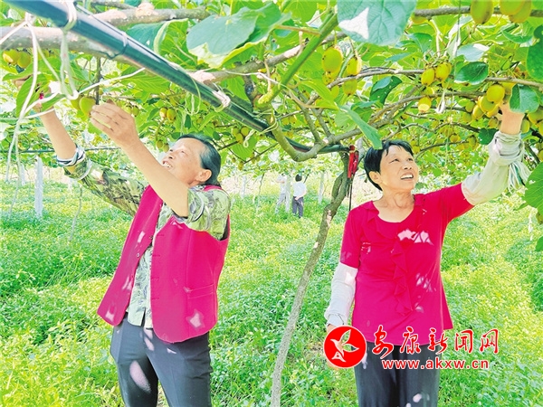 走進觀音河鎮(zhèn)水田村獼猴桃種植基地,放眼望去,片片綠葉下,一個個果型飽滿、大小勻稱的獼猴桃掛滿枝頭。陽光透過片片綠葉,照射在青黃色的果實上,清新的果香隨風四溢。