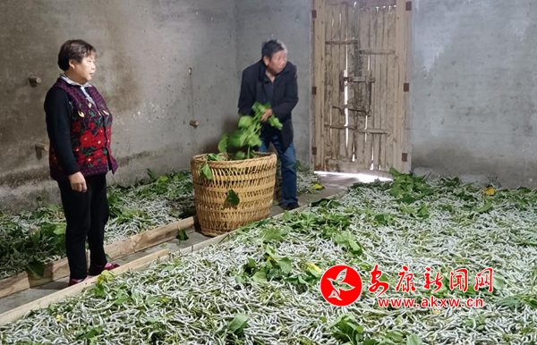 在南窯村家庭養殖合作社,蠶子正趕上四齡期,每天要吃三遍桑葉,早上要上山采摘桑葉,采回來后要進行清洗、消毒,然后再給蠶喂,蠶桑合作社負責人王祖忙得不可開交。