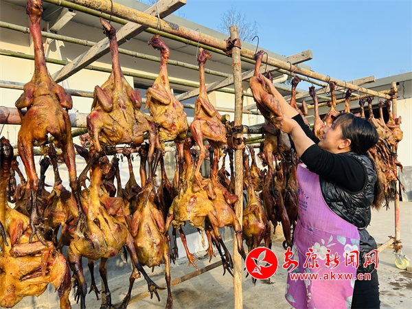 進入臘月,位于大山深處的鐵佛寺鎮共同村也熱鬧了起來,一大早,共同村經濟合作社負責人章漢和工人們正忙著加工制作熏雞,據加工師傅曹承香介紹,熏雞是將在桑園地露天放養的土雞屠宰后,輔以農家秘制佐料腌制,并進行晾曬、煙熏,制作出的熏雞色澤金黃、肉質緊致、口感極佳。2021年開始,共同村合作社利用生態優勢,以當地散養土雞為原材料,用傳統的熏制臘味的工藝開始制作熏雞。