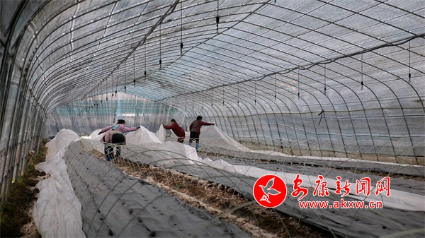 在漢陰七葉蓮鑫聚農業科技有限責任公司的蔬菜大棚里,工人們正在為移栽不久的圣女果、西紅柿等蔬菜幼苗覆蓋二層鞏膜,同時,對育苗溫室、塑料大棚等設施進行全面檢查,發現問題及時維修,確保設施安全。
