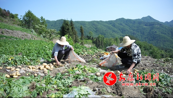 “大家加把勁兒,惠康源公司今天下午要2000斤土豆。”在漢陰縣雙河口鎮黃龍村的土豆種植基地里,駐村第一書記唐建安一邊忙著和村民一起采收土豆,一邊督促進度。十余位村民分工有序,忙而不亂,隨著鋤頭的揮舞,一顆顆外觀飽滿、個頭勻稱的土豆破土而出,分揀、裝袋……田地里每個人的臉上都掛滿了豐收的喜悅。