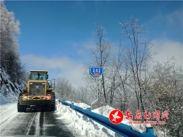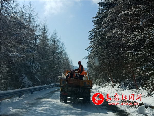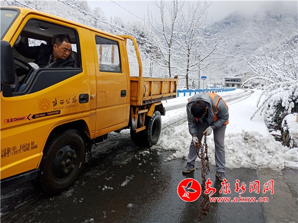 2020年1月7日嵐皋公路段職工在國道541線平利縣八仙真化龍山路段清理路面積雪。