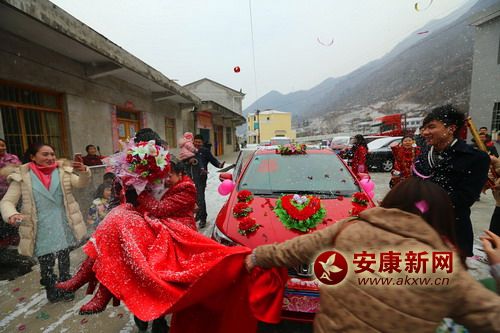 安康新網訊(通訊員 楊寧 陳苗)1月29日早上7點半,家住寧陜縣城關鎮朱家咀村小堰組的武道勝來到了同村的黃靜家,他帶領著迎親的隊伍,來迎娶他的妻子黃靜。天公作美,為一對新人送去了象征純潔愛情的瑞雪,鋪滿了屋頂、道路。四面八方趕來的親朋好友齊聚一堂,共同分享了一對新人的喜悅!