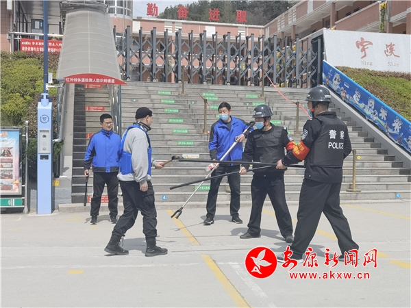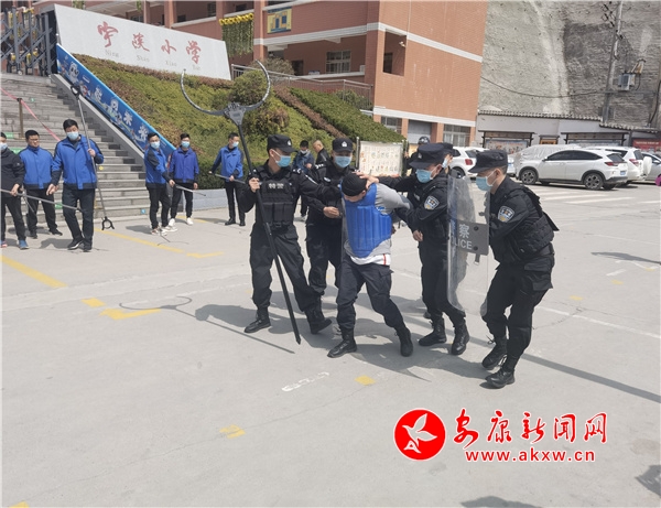 演練開始,下午1點30分,入校音樂響起,兩名校警、家長護衛隊、值班老師站在校門口執勤,大部分學生已進入校園,還有十幾名學生正在排隊等待入校。此時,在學校旁邊閱讀吧門口徘徊的一名身份不明的“歹徒”突然舉著砍刀沖向校門口,企圖闖入校園,值班校警見狀立即啟動一鍵式報警向公安部門求助,值班老師快速做出反應,拉響學校警報,關閉伸縮門,組織未入校的學生趕往緊急避難場地躲避。同時,校警和值班老師手持器械,在校門口對“歹徒”進行阻擊,拖延時間。RvL安康新聞網