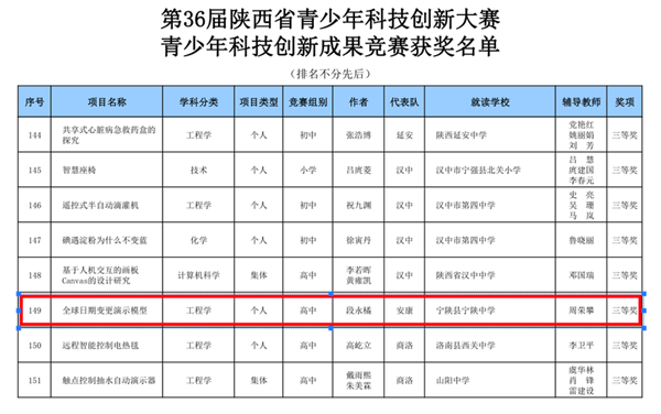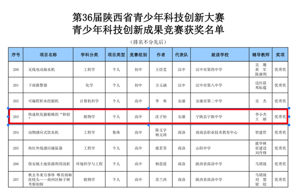 據(jù)悉,陜西省第36屆青少年科技創(chuàng)新大賽由省科協(xié)、團省委、省婦聯(lián)共同主辦。大賽分青少年科技創(chuàng)新成果競賽、科技輔導員創(chuàng)新成果競賽、青少年科技實踐活動、青少年科技創(chuàng)意比賽、少年兒童科學幻想繪畫比賽等五個類別。全省高中組青少年科技創(chuàng)新成果競賽共評出108個獎項,其中一等獎9項,被推薦參加全國大賽僅7項。我校兩名學生的科技創(chuàng)新項目榮獲一等獎,并拿到參加全國大賽通行證實屬不易,彰顯了學校科技創(chuàng)新特色發(fā)展的強大實力。