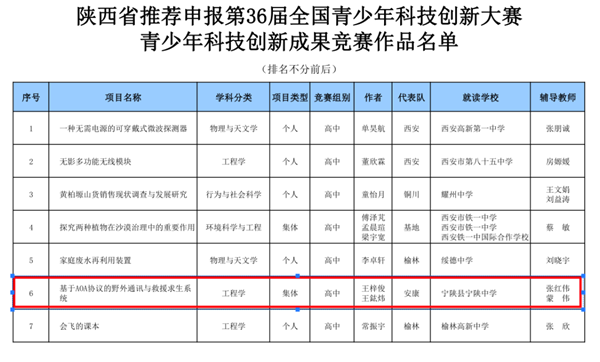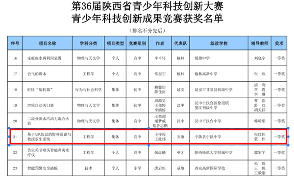 本網(wǎng)訊(通訊員 李小杰)日前,陜西省第36屆青少年科技創(chuàng)新大賽獲獎名單公布,寧陜中學申報的4項科技創(chuàng)新成果全部獲獎,其中:高二(2)班王梓俊、王鈜偉同學的《基于AOA協(xié)議的野外通訊與救援求生系統(tǒng)》項目榮獲一等獎,并被推薦參加全國第36屆青少年科技創(chuàng)新大賽,又一次入圍全國大賽。高二(5)班學生王國棟的《拓撲網(wǎng)絡構建與海明校驗的實驗探究》榮獲二等獎、高三(4)班學生段永橘的《全球日期變更演示模型》榮獲三等獎、高三(4)班學生沈子怡的《快速軟化獼猴桃的“妙招”》榮獲優(yōu)秀獎。獲獎項目涵蓋工程學、計算機科學、地理學和植物學等多學科領域。